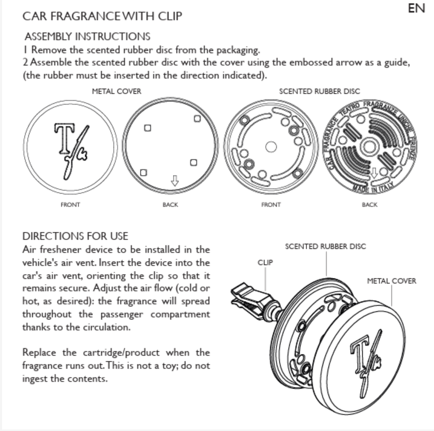 POMPELMO PEPE CAR FRAGRANCE Contains: linalyl acetate; hydroxycitronellal; citrale; citronellol; a-hexyl cinnamic aldehyde; pin-2(3)ene; delta 3 carene; methyl cedryl ether; methyl 2,4-dihydroxy-3,6-dimethylbenzoate; l-alpha-pinene; cedr-8-enyl methyl ketone. May cause an allergic skin reaction. Toxic to aquatic life with long lasting effects. Do not release into the environment. If skin irritation or rash occurs: get medical advice/attention. Dispose of the contents/container in accordance with local regulations. Composition: non-toxic compound of thermoplastic polymers, non-toxic masterbatch colorant and fragrance oil. This is not a toy. Keep out of reach of children and pets. Store the product in a cool dry place. Do not leave the product in an environment above 85° C. UFI: 2R22-J8VA-300V-QGM1